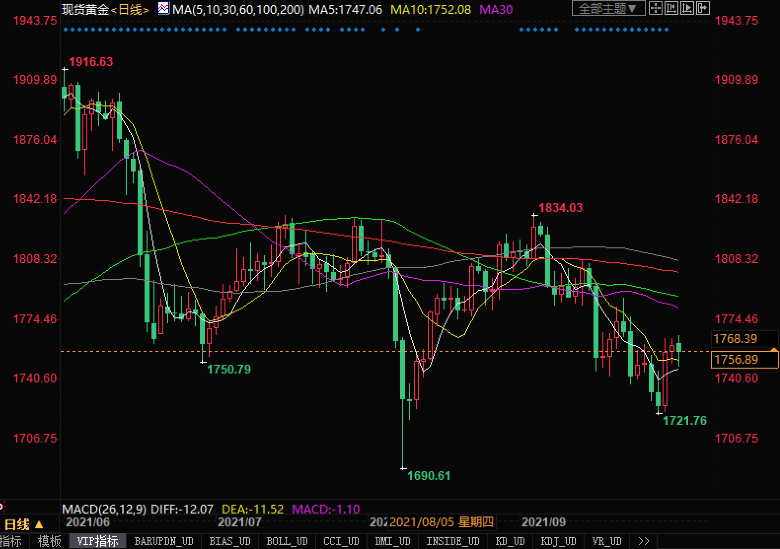 北京时间10月4日20:54,现货黄金报1756.89美元/盎司。