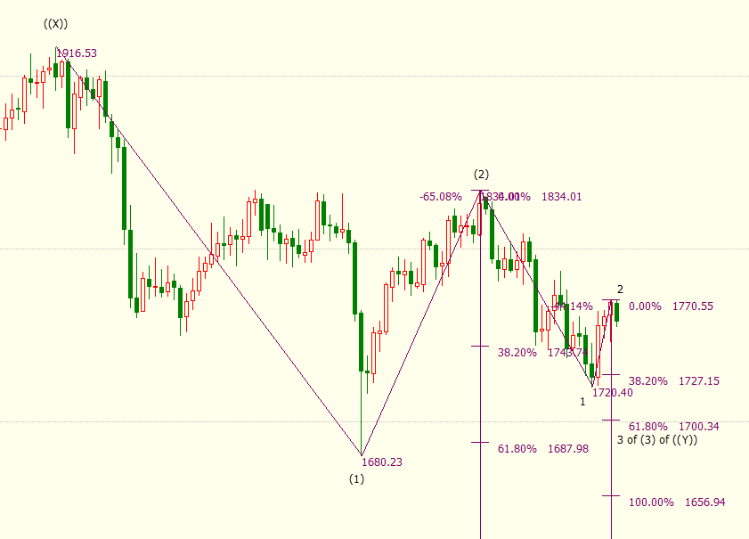 日线图上看,金价自1770美元开启下行3浪走势,下方支撑看向23.6%目标位1744美元。3浪是自1834美元开启的下行(3)浪的子浪。(3)浪则是自1917美元开启的下行((Y))浪的子浪。((Y))浪隶属于自2075美元5开启的调整IV浪。