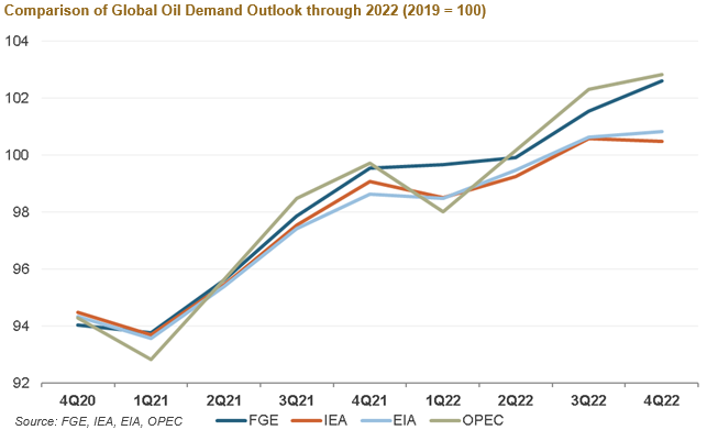 根据四个主要跟踪组织的数据,2022年石油需求将恢复至疫情前的水平,每天超过1亿桶。石油价格高企,是因为OPEC+在疫情期间为了满足运输燃料急剧下降的需求,创纪录地削减了供应,目前每天仍有数百万桶石油停产。