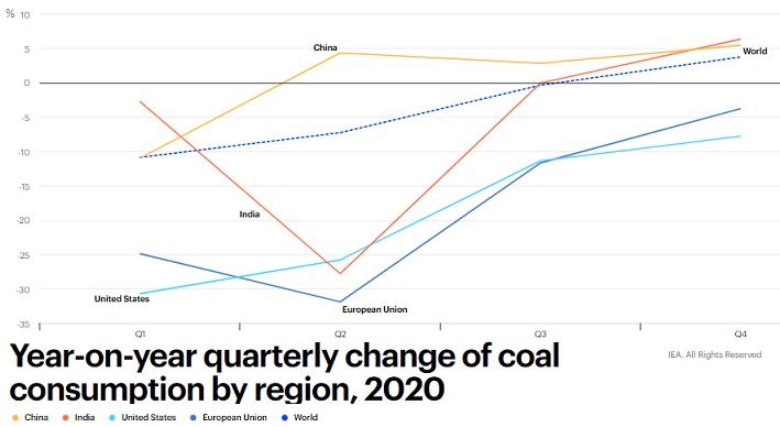 国际能源署的数据显示,2020年全球对煤炭的需求超过了疫情前的水平。今年全球煤炭需求预计将增长4.5% ,超过2019年的水平。2020年全球天然气需求下降1.9%,和其他能源相比降幅较小。不过,国际能源署预计2021年天然气需求将增长3.2% 超过4万亿立方米。