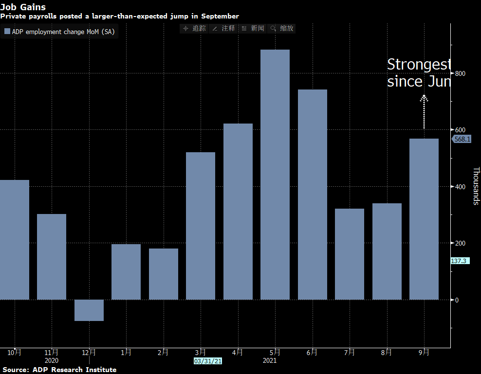 ADP数据显示美国9月份新增就业好于分析师预期,进一步增强了市场对美联储下月减码购债的信心。强劲的就业报告缓解了对招聘困难的忧虑,但市场的波动依然剧烈,因为人们担心通胀持续时间可能比美联储预期的更久,尤其是在面对今冬能源供应紧张的时候。