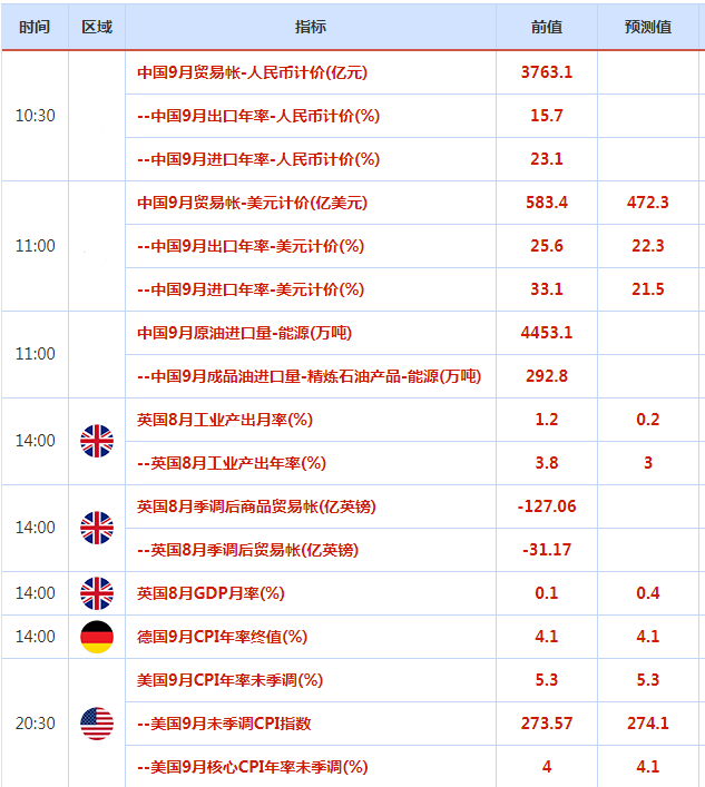 周五亚欧时段市场相对数据较少,主要关注纽约时段的美国9月零售销售数据,该数据因为对行情的影响较大,市场关注度较高,有着“恐怖数据”的俗称,投资者需要重点关注。