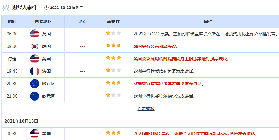 需要提醒的是,周一恰逢美国哥伦布日,美国金融市场周一休市,受此影响,本周的API原油库存数据和EIA原油库存数据均延迟一个交易日公布,API原油库存将于北京时间10月14日凌晨4:30出炉,EIA原油库存数据将北京于10月14日23:00公布。