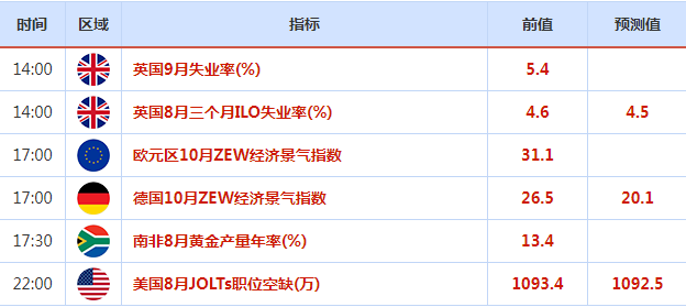 周二欧洲时段,需要留意一下英国9月份的就业数据和欧元区10月份的景气指数。