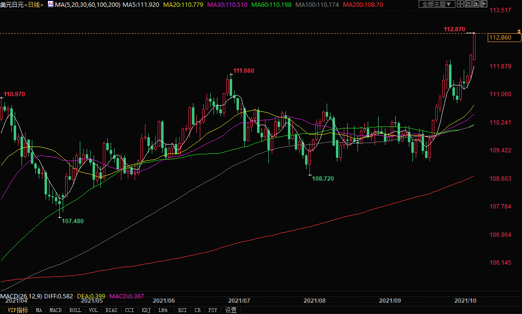 北京时间10月11日16:03,美元兑日元报112.87/89。