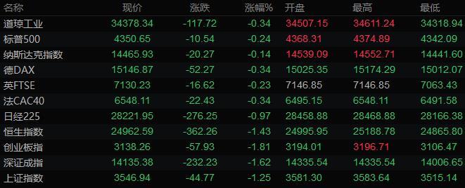 美股收盘情况:标普500指数下跌0.2%,报4350.65点;道琼斯工业平均指数下跌0.3%,报34378.34点;纳斯达克综合指数下跌0.1%,报14465.92点;纳斯达克100指数下跌0.4%,报14662.11点;罗素2000指数上涨0.6%,报2234.271点。