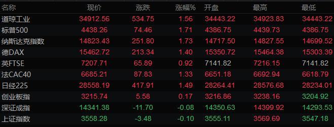 美股收盘情况:标普500指数上涨1.7%,纳斯达克100指数涨1.9%,道琼斯工业平均指数上涨1.6%。