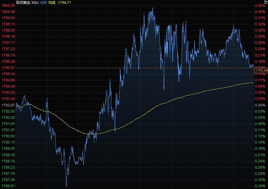金价周四触及一个月高位,因美元和美债收益率下跌令投资者转向黄金以对冲通胀风险;现货黄金一度涨0.42%,触及9月15日以来最高1800.55美元。