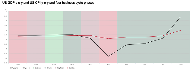 美国国内生产总值(GDP)与消费物价指数(CPI)与商业周期的四个阶段