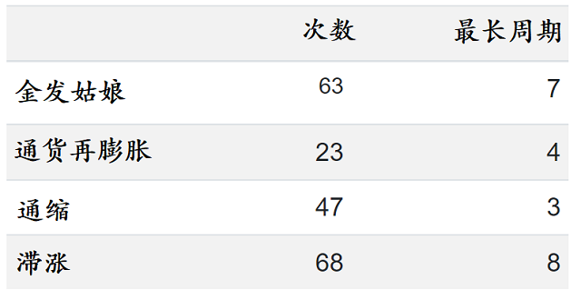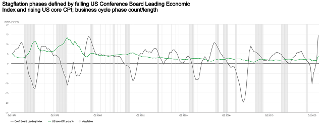 由美国谘商会领先指数下降和美国核心CPI上升的滞胀阶段,商业周期阶段计数/长度