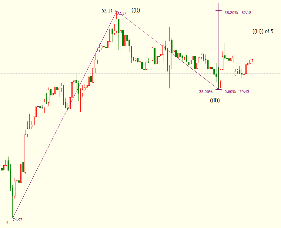 日线图上看,美油处于自61.74美元开启的上行((3))浪,上方阻力看向38.2%目标位88.66美元。小时图上看,油价处于自79.43美元开启的上行((iii))浪,上方阻力看向38.2%目标位82.18美元和61.8%目标位83.88美元。((iii))浪是自74.97美元开启的上行5浪的子浪。