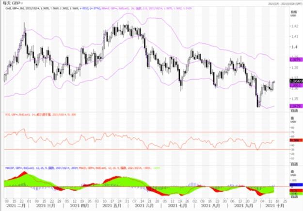 英国公布的8月GDP数据一度推升英镑涨幅达到0.4%。英国经济在7月录得六个月以来的首次萎缩后,8月又恢复增长,金融市场因而继续押注英国央行将在年底前开始加息。英国央行看起来将成为自疫情爆发以来第一家升息的主要央行。金融市场押注到12月指标利率将升至0.25%,目前处在0.1%的历史最低水平。从基本面来看,在11月初美联储正式宣布缩减购债之前,英镑下行的压力仍然会持续存在。技术面上,英镑近期持续横盘,9月底以来的反弹明显动力不足,而且仍然处于1.3913-1.3412区间50%回撤位下方,对多头也相当不利。如果英国央行拒绝提早收紧货币政策的呼吁,未来两个月英镑兑美元可能会短暂跌至1.32。目前多空双方仍在博弈当中。英镑下方需要关注的是低位1.3569,跌破这一支撑则下看1.3531,这是23.6%回撤位,跌破这一水平可能打开通往9月29日低位1.3412的大门。上方关注日高1.3644,进一步关注10月11日高位1.3674以及50日均线所在的1.3725。