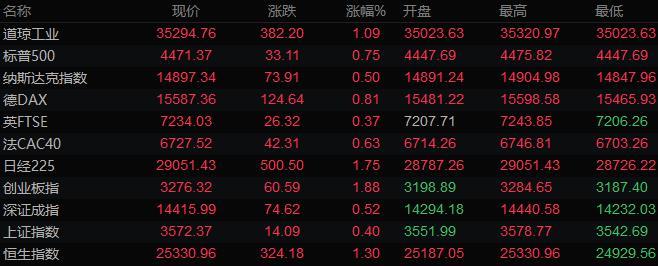 美股收盘情况:标普500指数上涨0.8%,报4471.37点;道琼斯工业平均指数上涨1.1%,报35294.76点;纳斯达克综合指数上涨0.5%,报14897.34点;纳斯达克100指数上涨0.6%,报15146.92点;罗素2000指数下跌0.4%,报2265.654点。