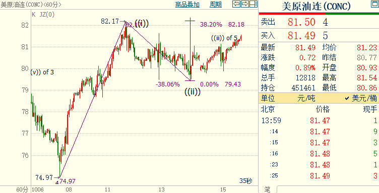日线图上看,美油处于自61.74美元开启的上行((3))浪,上方阻力看向38.2%目标位88.66美元。小时图上看,油价处于自79.43美元开启的上行((iii))浪,上方阻力看向38.2%目标位82.18美元和61.8%目标位83.88美元。((iii))浪是自74.97美元开启的上行5浪的子浪。