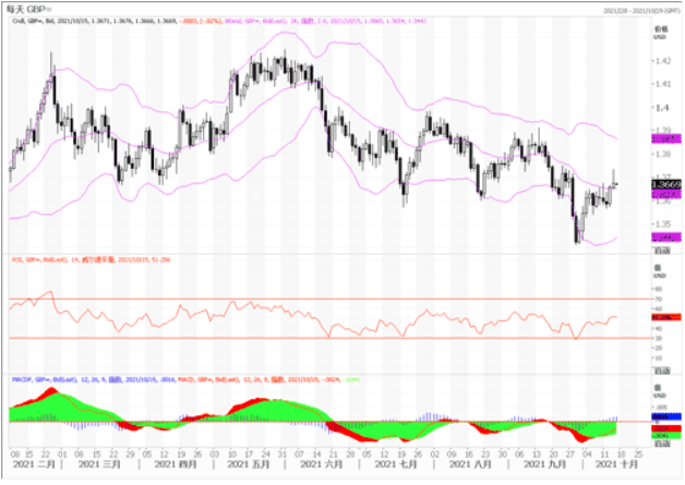 周四欧元自周三的高点有所回落。周三,美国劳工统计局(BLS)公布通胀数据。9 月消费者物价指数上升5.4%,高于分析师预期的 5.3%,表明美国居民正在努力应对价格上涨。此外,剔除食品和能源成本的核心消费者价格指数上升 4%,与前值持平。继美国通胀数据公布后最初是美元走强,但似乎市场已经对物价上涨有所消化,随后美元下跌,提振欧元。技术图形上,日图欧元/美元交投于日均线远下方,仍处在下跌趋势当中,但技术指标超卖严重。周三欧元/美元构筑看跌吞噬 K 线,表明汇价可能维持朝上,但需突破心理关口 1.1600 强劲阻力。此外,10月4日高点 1.1639 成为多头的强阻力。若欧元/美元日线收于 1.1600 上方,则第一个测试水平将是上述 1.1639。若汇价突破该水平,可能会测试 50 日均线所处水平 1.1719。下行方面,在相对强弱指标等动能指标支持下,汇价仍维持下跌趋势,相对强弱指标处在中线50下方,若汇价跌破 1.1600,将测试 2021 年低点 1.1524。