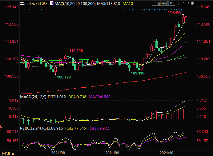 周一(10月18日)亚市早盘测试了三年高点114.46后,美元兑日元整理于114.00上方,多头重启升势前暂歇。