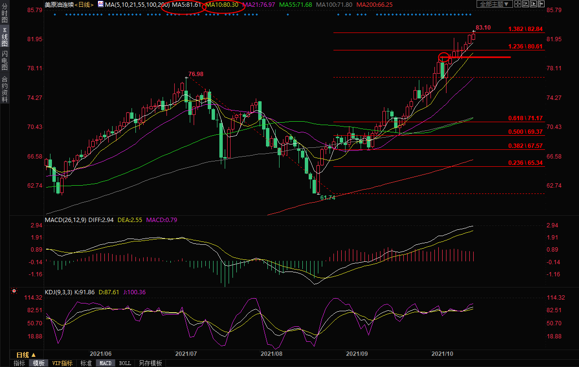 不过,油价从8月底以来持续涨势,短线涨幅较大,KDJ早已发出超买信号,MACD也轻微顶背离,K线显示短线上涨动能较弱,需要提防油价震荡调整或者高位回调,甚至是震荡筑顶的可能性。此外,由于油价尚未顶破76.98-61.74跌势的138.2%回撤位82.84阻力,如果持续承压于该阻力,将增加后市回调风险。