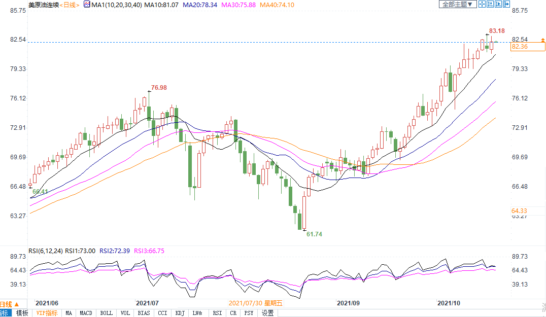 技术指标显示原油期货价格进入超买区域,美油期货14日相对强弱指标在70上方,预示或有回调。