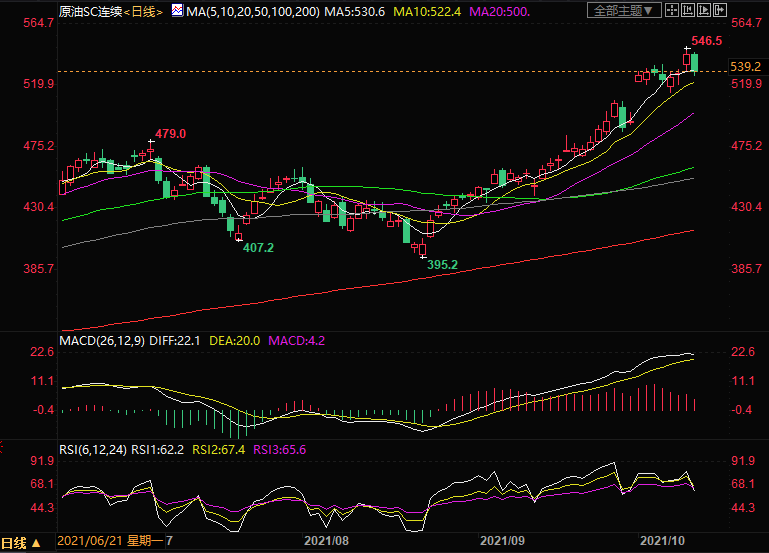 上海原油价格下跌,主力合约2112终盘收于530.4元/桶,跌7.5元/桶,跌幅1.39%。