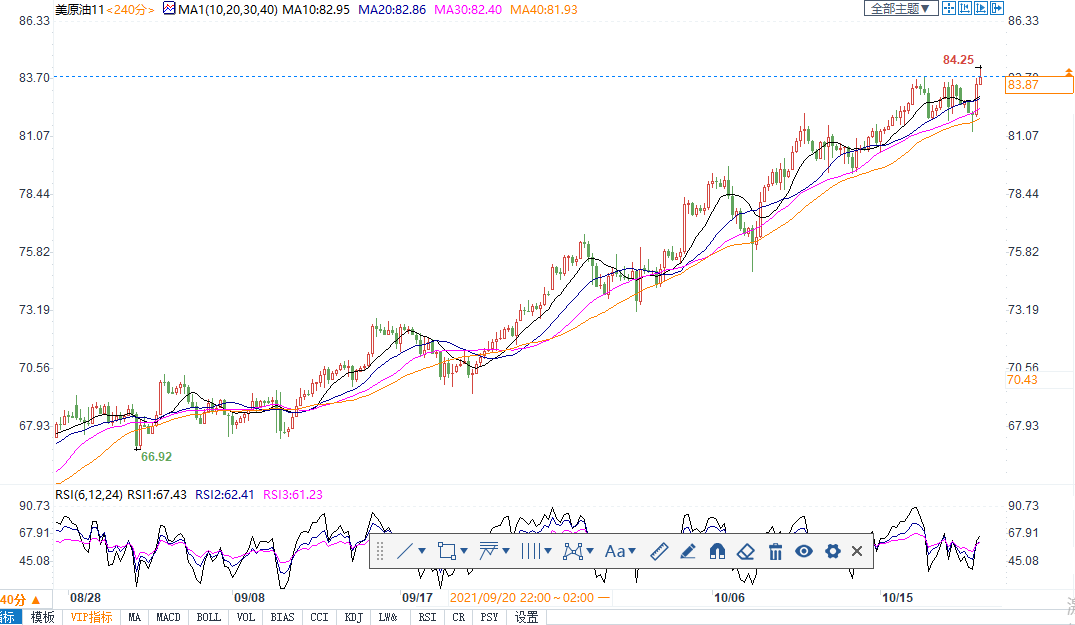 周三(10月20日)到期的11月美国原油期货上涨0.91美元,涨幅为1.3%,结算价报83.87美元/桶,交投更活跃的12月合约上扬0.98美元,结算价报83.42美元/桶。布油上涨0.74美元,涨幅为0.9%,报收85.82美元,为2018年10月以来的最高水平。早前公布的EIA库存报告显示,截至10月15日当周,原油库存意外下降,其中美国最大原油存储地的库存触及三年来最低水平。