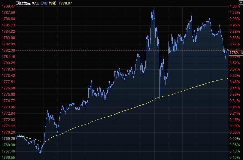 金价周三跳涨,现货黄金刷新本周高点至1788.47美元/盎司,此前美元走软,对通胀上升和供应链问题的担忧提振黄金吸引力。