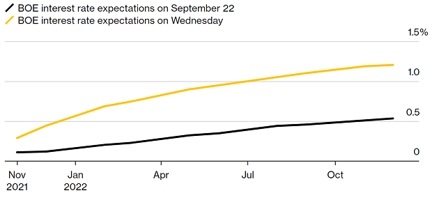 重新定价的速度是惊人的。仅仅四周时间,市场就将英国央行的关键利率将达到0.5%的预期提前了九个月,这是受政策制定者贝利(Andrew Bailey)的推动,他在上周末表示,英国央行将“不得不采取行动”抑制通胀力量。