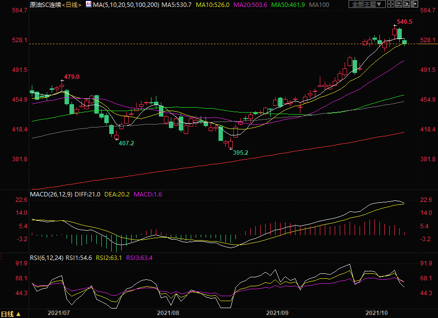 上海原油价格下跌,主力合约2112终盘收于524.4元/桶,跌8.7元/桶,跌幅1.63%。