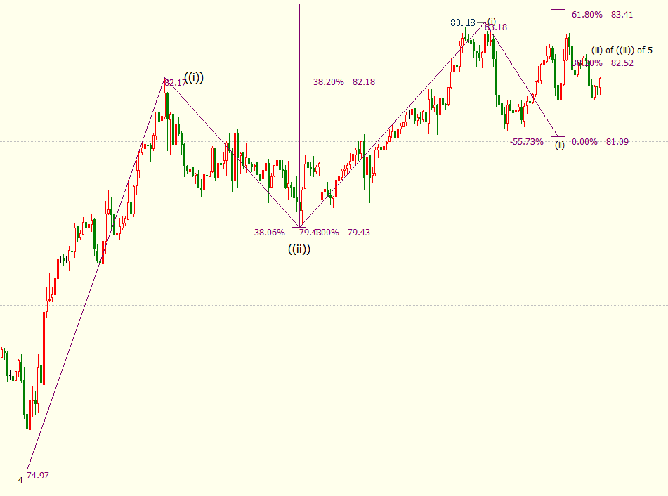 小时图上看,油价处于自81.09美元开启的上行(iii)浪,料重新站上38.2%目标位82.64美元,并进一步挑战61.8%目标位83.41美元。(iii)浪是自79.43美元开启的上行((iii))浪的子浪,((iii))浪是自74.97美元开启的上行5浪的子浪。