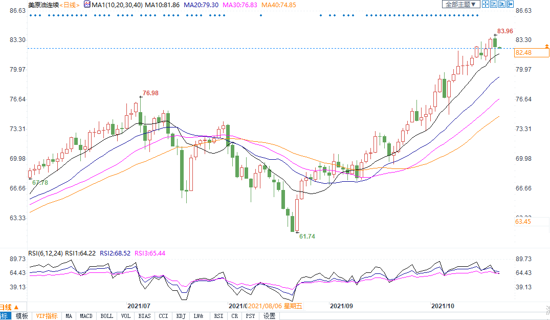 周四(10月21日)美油期货下跌0.92美元,跌幅为1.1%,结算价报82.50美元/桶,创近两周最大跌幅。布油下跌1.21美元,跌幅为1.41美元,报收84.61美元/桶,此前曾触及2018年10月以来最高的86.10美元。因对全球经济增长担忧加剧,叠加美国国家海洋及大气管理局发布消息称,美国大部分地区的冬季气温预计将高于平均水平,油价一度大跌至近一周低位。