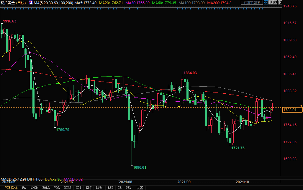 北京时间10月21日,现货黄金报1783.01美元/盎司。