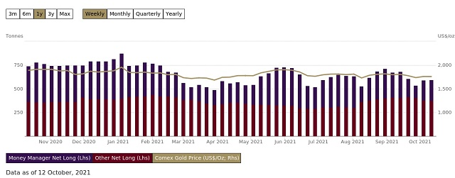 另一方面,虽然10月以来金价逐渐走高,但美国商品期货交易委员会(CFTC)交易员承诺报告的数据显示虽然管理基金对美国黄金期货的多头持仓有小幅回升,但其他投资者的多头仓位在本月前两周依然降低了。这份报告经常被用作黄金价格的市场情绪指标。