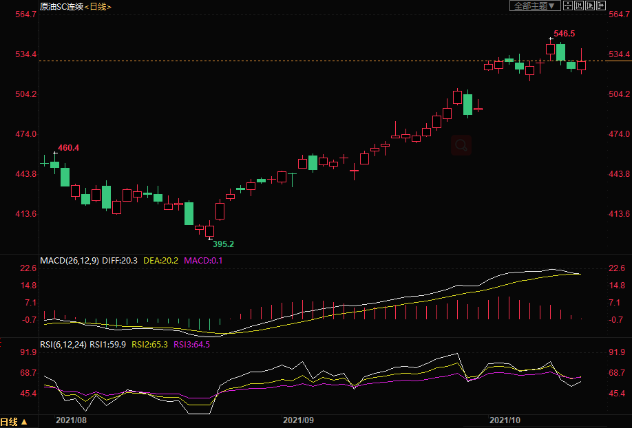 上海原油价格上涨,主力合约2112终盘收于529.8元/桶,涨3.7元/桶,涨幅0.7%。