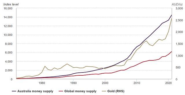 (澳大利亚货币供应-蓝色;全球货币供应-红色;黄金-黄色)