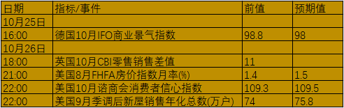 10月25日-31日当周,市场将迎接一系列重磅数据和事件。事件方面,关注加拿大央行、日本央行及欧洲央行利率决议。数据方面,美国三季度GDP、美国PCE、EIA、初请、个人支出、欧元区GDP、CPI等都将陆续出炉,投资者需密切关注。值得注意的是,下周美联储将迎来噤声期,因11月4日凌晨美联储将举行11月议息会议。