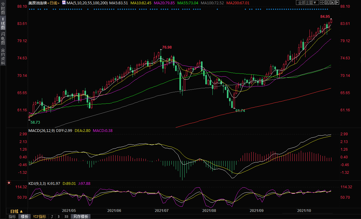 通常会导致更寒冷冬季的拉尼娜现象(La Nina)渐行渐近,预计将加剧亚洲的能源危机。这继续给国际油价提供上涨动能,美原油期货周一(10月25日)延续涨势,一度刷新近七年高点至84.95美元/桶。