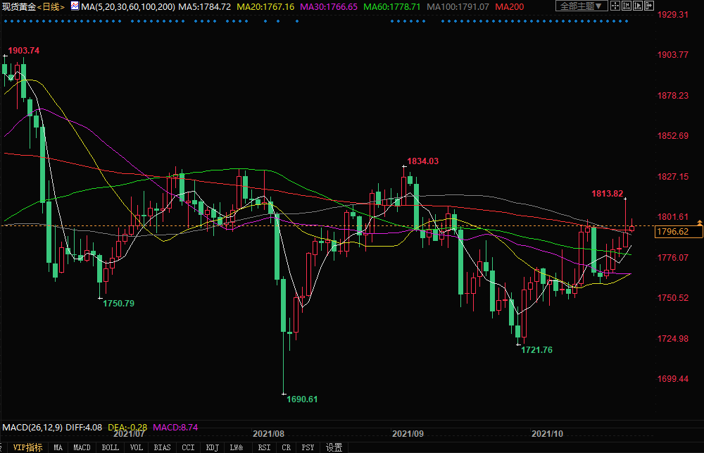 上周五,黄金价格一度涨至1813美元/盎司上方,创逾一个月新高。周一(10月25日)亚市早盘,现货黄金小幅上涨,目前交投于1800美元/盎司下方不远处。