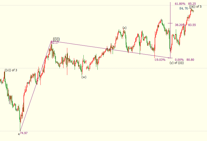 小时图上看,油价处于自80.80美元开启的上行((iii))浪,后市料升上61.8%目标位85.25美元和76.4%目标位86.30美元。((iii))浪是自74.97美元开启的上行5浪的子浪。