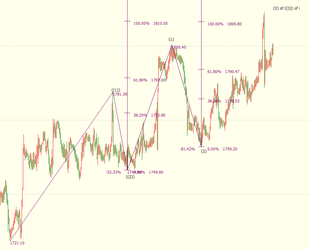 小时图上看,金价自1759美元开启上行(3)浪走势,料升破100%目标位1810美元,后市料上看(3)浪123.6%目标位1822美元。(3)浪是自1750美元开启的上行((3))浪的子浪。((3))浪的123.6%目标位在1824美元。