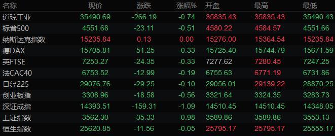 美股收盘情况:道琼斯指数收跌266.25点,跌幅0.74%,报35490.63点;标普500指数收跌21.79点,跌幅0.48%,报4553.00点;纳斯达克综合指数较上一交易日基本持平,报15235.84点;罗素2000指数下跌1.9%,为9月末以来最大跌幅。