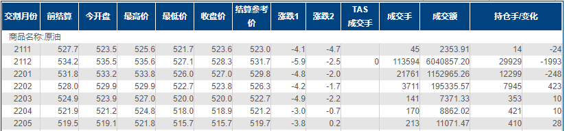 上海原油价格下跌,主力合约2112终盘收于528.3元/桶,跌5.9元/桶,跌幅1.1%。