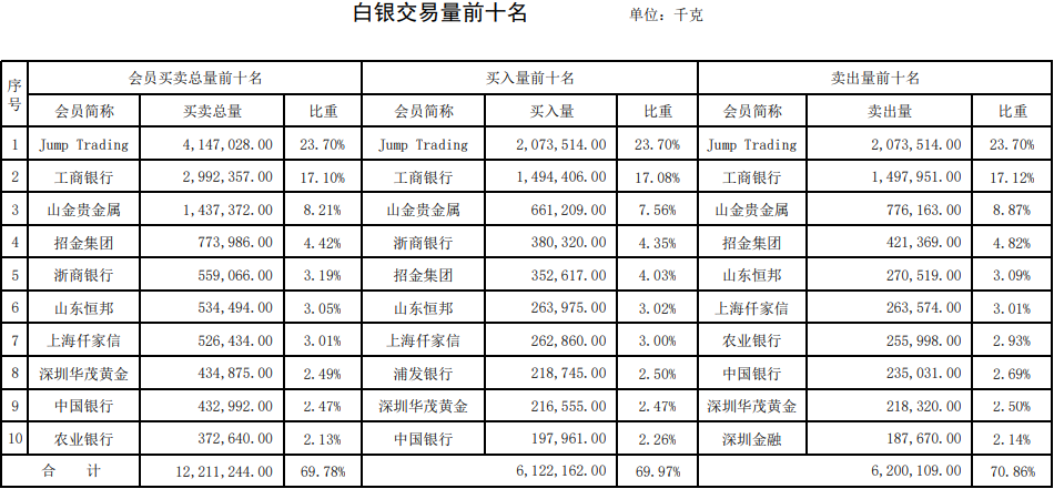 白银交易方面,量化交易机构Jump Trading位居榜首,成交占比从22.28%升至23.70%,工商银行排第二,成交比重从16.81%升至17.10%。