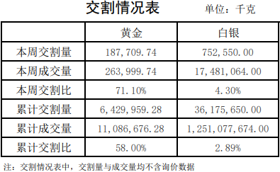 黄金交割比由66.27%升至71.10%,白银交割比由4.01%升至4.3%。