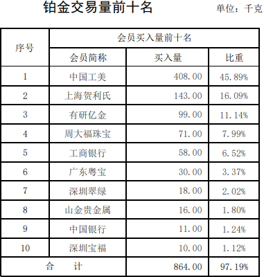 铂金交易方面,中国工美占据榜首位置,买入量达408千克,占比45.89%,上海贺利氏第二,有研亿金第三。