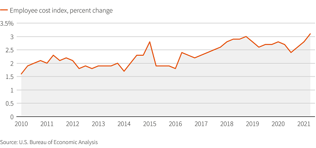 鲍威尔在8月份表示:“目前我们几乎没有看到工资上涨导致过度通胀的迹象。”补偿成本的增长速度还没有超过通货膨胀和工人生产率的增长速度。这是衡量更高的员工成本是否会导致更高的价格的粗略标准。如果雇员成本的上升速度快于通货膨胀和每个工人生产的价值的变化,美联储就会注意到。