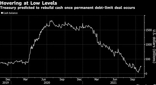 NatWest Markets策略师Jan Nevruzi表示,"目前很难确定票据发行水平,因为这实际上取决于财政部现金耗尽的速度,以及债务上限解决的速度。"NatWest的预计的情况是,债务上限将在11月或12月初解决,这将使美国财政部在2022年将净票据发行量提高约3000亿美元,使其现金余额回到约8000亿美元。