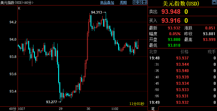 北京时间19:48,现货黄金下跌0.23%至1789.13美元/盎司;COMEX期金主力合约下跌0.32%至1790.2美元/盎司;美元指数上浮0.07%至93.939。