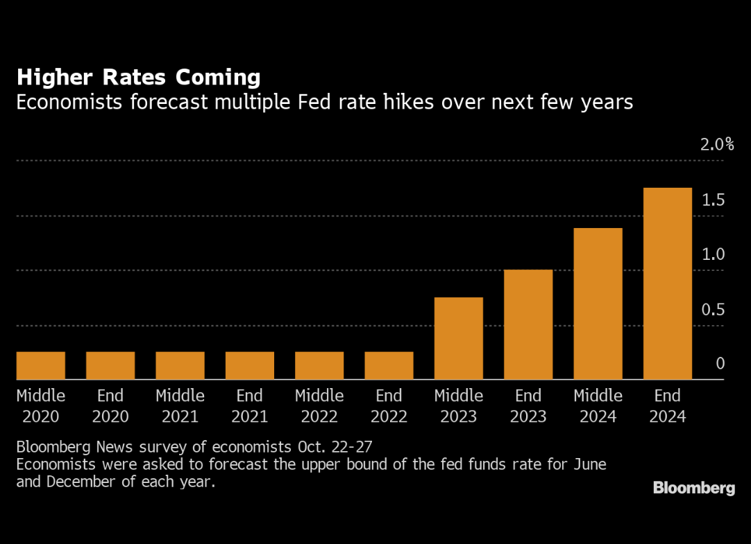 ① 委员会决定将联邦基金利率目标区间维持在0%至0.25%,并预计,在劳动力市场条件达到与委员会对充分就业的评估相一致的水平、且通胀率已经升至2%并有望在一段时间内适度超过2%之前,维持这一目标区间是合适的