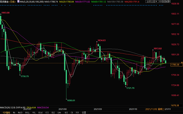 北京时间11月3日14:40,现货黄金报1780.38美元/盎司。