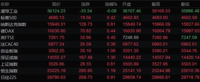 美股收盘情况:道琼斯指数收盘下跌32.72点,跌幅0.09%,报36124.86点;标普500指数收盘上涨20.32点,涨幅0.44%,报4680.89点;纳斯达克综合指数收涨128.7点,涨幅0.81%,报15940.3点。