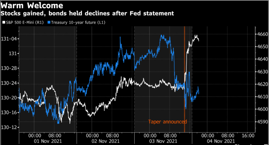 美联储周三(11月3日)宣布开始削减债券购买规模,但表示官员们在加息方面可以保持耐心。美国股市创下纪录收盘高位,美国国债下跌、收益率曲线温和走陡,一定程度上扭转了近期走平的趋势。